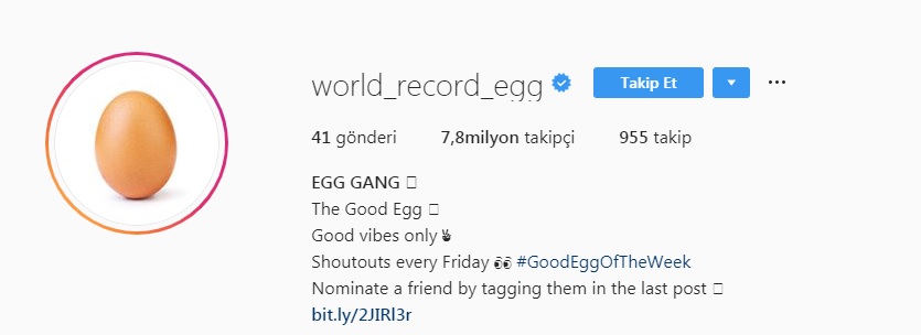 Ocak ayında enteresan bir Instagram hesabını paylaşmışım. Hesabın ilginçliği ise tek bir yumurta fotoğrafı paylaşımı ile ulaşılan takipçi ve beğeni sayısı. O tarihte 3 milyon takipçisi olan hesap artık görüldüğü üzere 7 milyonu geçmiş durumda. Şunu da belirteyim ki 3 milyon takipçiye tek fotoğraf paylaşımı ile ulaşılmıştı. 7,8 milyonu daha sonra paylaştıkları fotoğraflar ile yakalamışlar. Hesabın profil fotoğrafında görülen yumurta fotoğrafı da ilk paylaştıkları ve 28 milyon görüntüleme alan ( an itibariyle 53 milyonu geçmiş ) fotoğraftır.