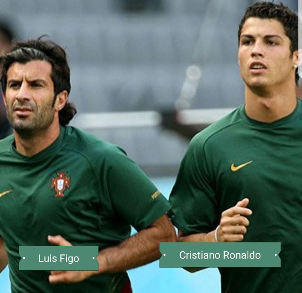 Z kuşağı çok iyi hatırlamaz fakat 2000li yıllar da Portekizli yıldız futbolcu denildiğinde akıllara gelen ilk isimlerden birisi Luis Figo’ idi. O zamanlar Cristiano Ronaldo 15 yaşlarında bir ergenken, Figo 2000’de UEFA tarafından Avrupa’da Yılın Futbolcusu, 2001’de ise FIFA tarafından Dünyada Yılın Futbolcusu ödüllerine layık görülmüş olup 5 sezon olmak üzere hem Barcelona hem de sonrası Real Madrid’te top oynamış Portekiz Milli Takımı’nın değişmez isimleri arasına girmişti. Kariyeri boyunca oynadığı 577 maçta 93 gol atmayı başarmıştı. Aşağıda ki fotoğrafta ustasının yanında koşan genç Ronaldo’yu görüyoruz.