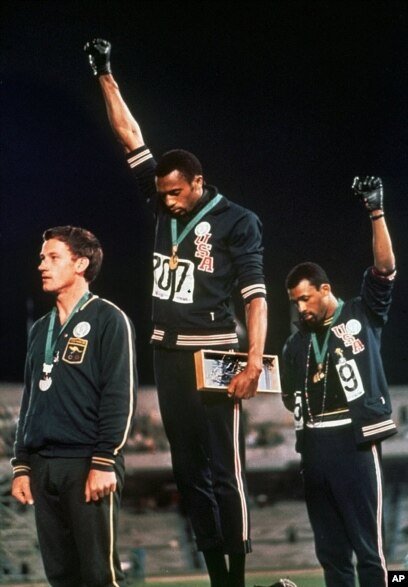 200 metre finali koşulmuş. Amerikalı (siyah) atletler Tommie Smith ile John Carlos birinci ve üçüncü gelirken, ikinciliği Avustralyalı (beyaz) Peter Norman kazanmış.