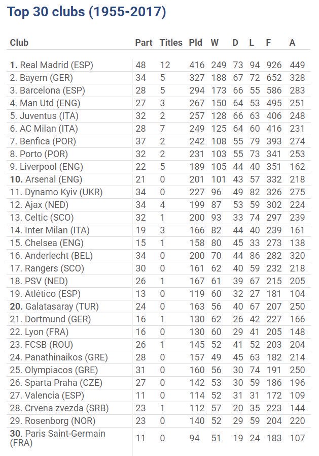 UEFA,  1955-2017 tarihleri arasında Avrupa’nın en başarılı 30  kulubünü açıkladı. İlk üç sıraya Real Madrid, Bayern Münih ve Barcelona yerleşirken yirminci sırada ise bir Türk takımı Galatasaray var. Dileğimiz ilerleyen yıllarda bu listeye ülkemizin diğer köklü kulüplerinin de girmesi.